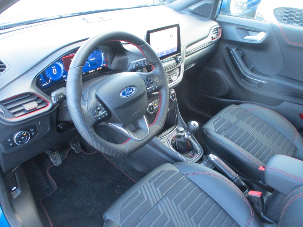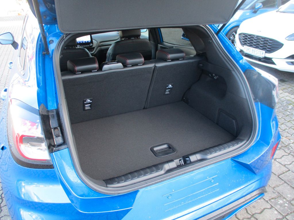 Ambiente-Beleuchtung vorn (LED), Antischlupfregelung (ASR), Audio-Navigationssystem Ford mit AppLink, Außenspiegel elektr. verstell- und heizbar, Blinkleuchte in Außenspiegel integriert, Body-Styling-Paket, Dachhimmel Stoff, dunkel, Eco-Anzeige für verbrauchsoptimiertes Fahren (EcoCoach), Fahrassistenz-System: Auffahrwarnsystem, Fahrassistenz-System: Berganfahr-Assistent (Hill-Holder), Fahrassistenz-System: Falschfahrer-Warnfunktion, Fahrassistenz-System: Notbrems-Assistent, Farbdisplay für Bordcomputer, FordPass Connect inkl. eCall, Fußmatten Teppich, Getriebe 6-Gang - Typ: 6MX65, Heckleuchten LED, Innenraumfilter: Staub- und Pollenfilter, Intelligent Protection System (IPS), Isofix-Aufnahmen für Kindersitz, Karosserie: 5-türig, Kombiinstrument Digitalanzeige 12,3 Zoll, Komfort-Paket, Kopfstützen hinten mechan. verstellbar (3 Stück), Laderaumboden variabel (Ford Megabox), Lendenwirbelstütze vorn, Lenkrad (Sport/Leder, ST), Lenksäule (Lenkrad) höhen-/längsverstellbar, LM-Felgen, Mild-Hybrid 92 kW (Motor 1,0 Ltr. - 92 kW EcoBoost), My Key (2. Fahrzeugschlüssel programmierbar), Nebelscheinwerfer LED, Otto-Partikelfilter (OPF), Pedale Aluminium, Radstand 2588 mm, Reifen-Reparaturkit, Reifendruck-Kontrollsystem, Rücksitzlehne geteilt/klappbar (60:40), Schadstoffarm nach Abgasnorm Euro 6d, Scheinwerfer LED, Scheinwerfer-Assistent mit Tag-/Nachtsensor, Sitzbezug / Polsterung: Kunstleder, Sitze vorn höhenverstellbar, Sonnenblende links mit Spiegel (beleuchtet), Sonnenblende rechts mit Spiegel (beleuchtet), Sound-System Bang & Olufsen Play, Spezialausführung 2, Sport-Fahrwerk, Sportsitze vorn, Türgriffe außen Wagenfarbe, Verglasung hinten abgedunkelt (Privacy Glass)